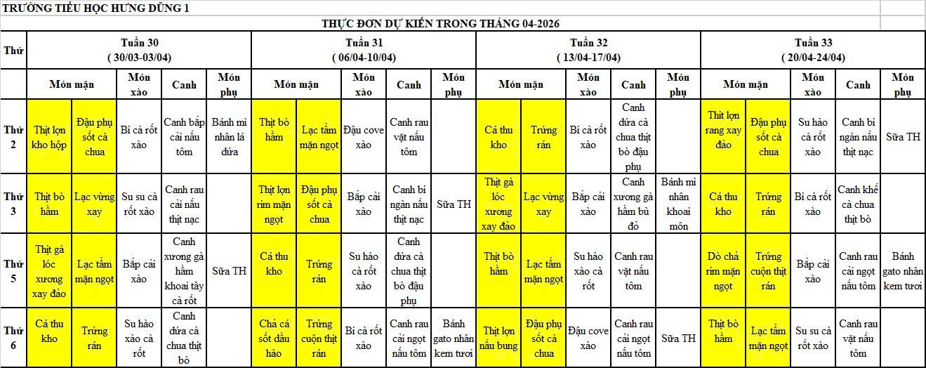THỰC ĐƠN BÁN TRÚ Tháng 12-2025